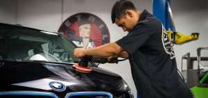Os Detailers iniciam cada restauração da pintura polindo um ponto de teste com a combinação menos agressiva de boinas de corte e polimento para determinar a maneira mais suave de alcançar a perfeição.