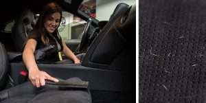 Vire-se para o lado da escova para suavemente espremer o cabelo e o pêlo de tecidos de pêlo baixo, vidro, ou bancadas. Os fios extra-grandes e o material composto de borracha macia tornam esta escova 100% livre de riscos em todos os tecidos, vidros, e superfícies de estofos. Use a escova para remoção de pêlos de animais domésticos em assentos de automóveis, auto caravana, camião, tapetes, móveis, camas, vestuário, e muito mais!