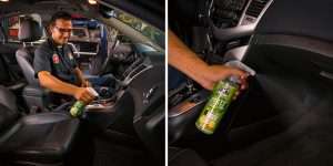 3. Aplicar ligeiramente à volta de tapetes, estofos de tecido, e debaixo dos assentos.